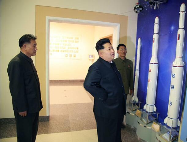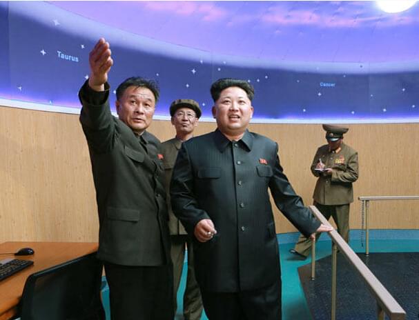 2015年5月3号金正恩视察卫星指挥所,观看火箭模型