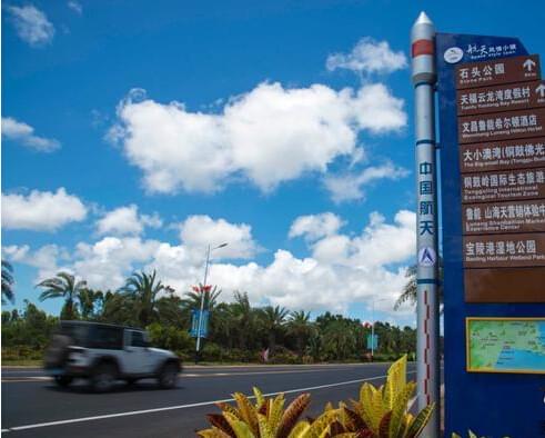 海南省文昌市龙楼镇街道旁用火箭模型制作的路牌亮相街头