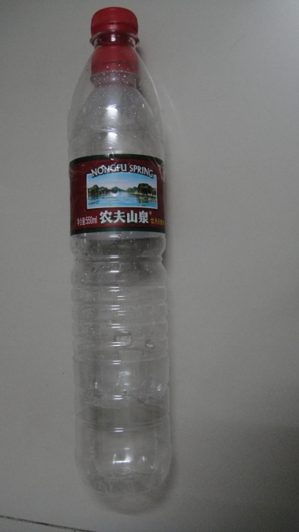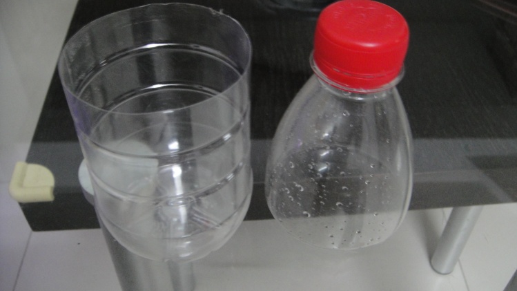 制作开始喽!因为感觉一支大矿泉水瓶不够火箭模型箭身的长度,我们决定再加套一支小矿泉水瓶,把小矿泉水瓶从三份之一处割断。