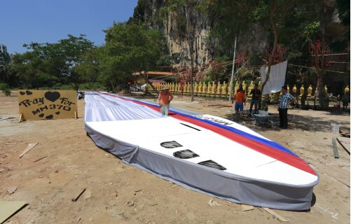 据马来西亚《光明日报》报道,马航MH370班机失联后,大马华人艺术家吴丰光带领逾10名员工在怡保观音洞前的一块空地上,以布料、木材和铁枝制作一架与波音777-200机身长度相近的模型,供民众在飞机模型上签名和写上祝福字句,以祈求该班机239人全部安全归来。