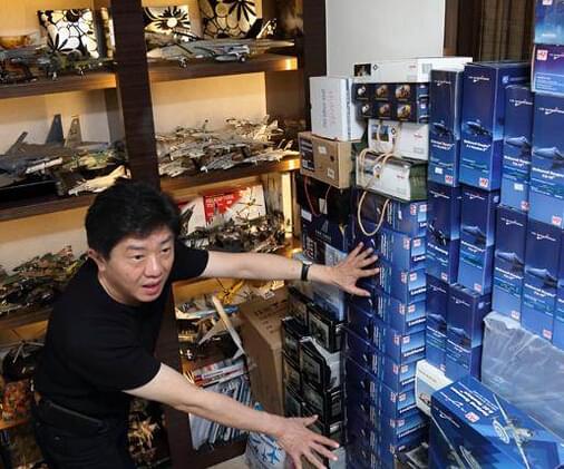 不过,对所有爱飞机模型成痴的男生来说,进入彭华干的军事模型小天地,就犹入进了宝库,眼光根本离不开这些陈列的战斗机模型,除了架上的军事模型外,房间的一整面墙,更堆了上百个纸盒,都是各式的模型机的盒子,原来这些盒子绝对不能丢,干哥回问:否则要怎么带出去?。模型的一端还有几本战斗机模型的原文书,他轻轻拿起书说:可以让你们摸飞机模型,但绝不能碰书,这些书他小心翼翼地照顾着,看起来像全新一样,这就是他不让人摸的原因。