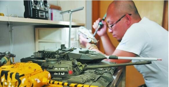 眼前这辆坦克与其他模型不大一样,它“上半身”是黄颜色的,“身子”两侧画着老虎的花纹,坦克的前方还画着老虎的眼睛和爪牙。“为了把‘老虎’画好可费了我不少功夫!”赖梁打开了话匣,这台坦克模型是照着朝鲜战争时期,美国战营的坦克制造的。“很多人不理解,觉得我不务正业,觉得这些模型就是玩具。”然而,赖梁说这与玩具可大不相同,它们看起来精美,可以作为礼品相赠,但不是艺术品,而是工业仿真品。虽然在市面上常有各式各样的模型,但很多都是流水线生产出来的,不仅没有细节,更不是完全按照实物比例还原的。“就说那个‘潘兴M26’,它就是按照1:16的比例制的。”赖梁说着,便演示起仿真品与艺术品的差别来。“你看,坦克上的舱门都是可以打开的。”在不足一毫米的舱门轴部穿孔、穿金属轴、套上可以开闭的舱门。赖梁说,这是最需要的耐心的部分,也是行家们看的“门道”。还有在同样不足一毫米粗的坦克的炮筒上穿孔、塞入漆包线连通LED制作出发炮效果、在坦克模型履带上方设置活动合页等等,都最大程度地还原了实体坦克。赖梁在坦克的尾部安装了拉绳,甚至还假设情景,当坦克陷入泥中不能移动时,另一架坦克连接上拉绳,通过牵引拉绳的方式来把泥中的坦克营救出来。